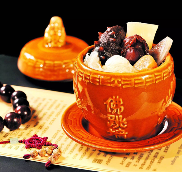 也稱“福壽全”,是用豬肚、雞鴨、羊肉、鴿蛋以及海產(chǎn)品等10多種材料,一起裝進(jìn)紹興酒壇,然后煨制而成。一開酒壇,滿室幽香,個(gè)中滋味,回味無窮。