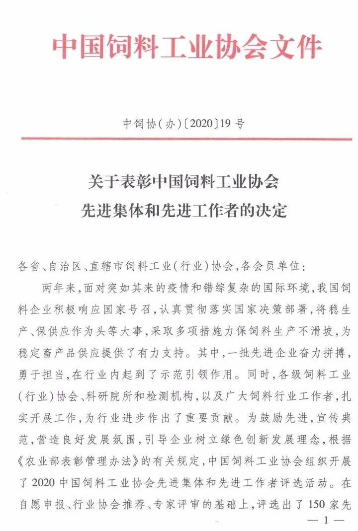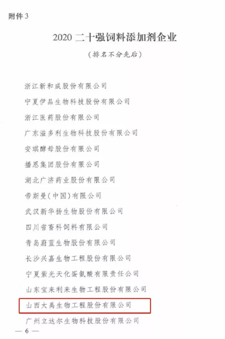 【喜訊】大禹生物榮獲2020全國二十強飼料添加劑企業(yè)稱號
